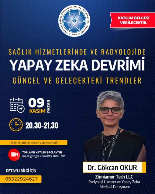 8 Kasım DÜNYA RADYOLOJİ GÜNÜ etkinlikleri kapsamında İngiltere ve ABD'de Zinniamor Tech LLC 'de Radyoloji Uzmanı olarak Yapay Zeka uygulamaları üzerine araştırma yapan Dr. Gökcan OKUR uzaktan bağlantı ile '' SAĞLIK HİZMETLERİNDE ve RADYOLOJİDE YAPAY ZEKA'' konulu bir seminer verecektir.